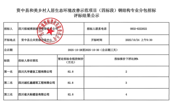 资中县和美乡村人居生态环境改善示范项目(四标段)钢结构专业分包招标评标结果公示