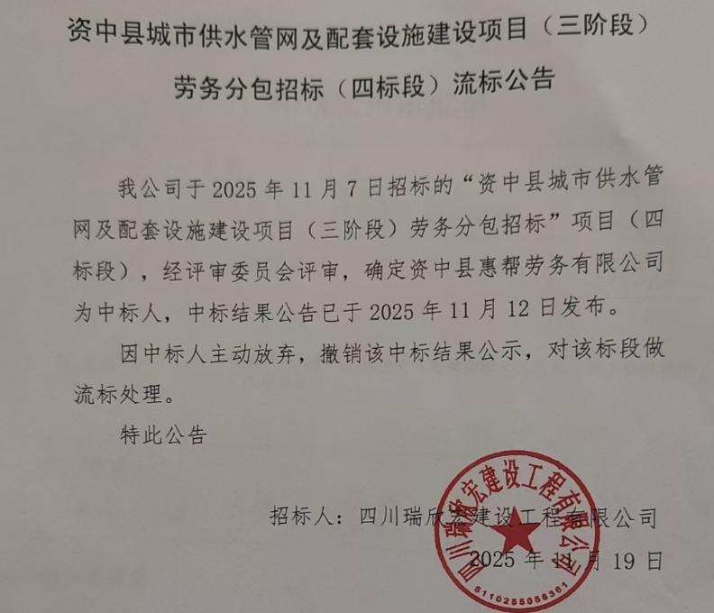 资中县城市供水管网及配套设施建设项目(三阶段)劳务分包招标(四标段)流标公告