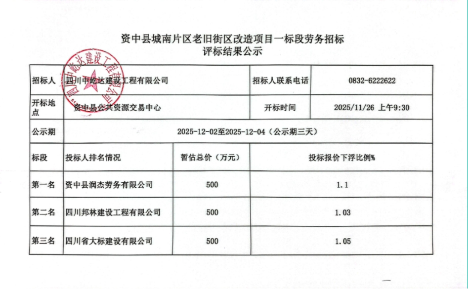 资中县城市供水管网及配套设施建设项目(三阶段)劳务分包招标(第二次)评标结果公示