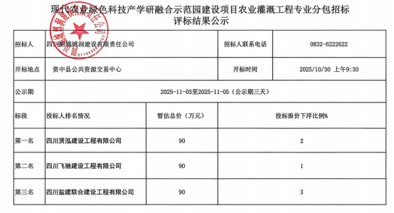 现代农业绿色科技产学研融合示范园建设项目农业灌溉工程专业分包招标结果公示