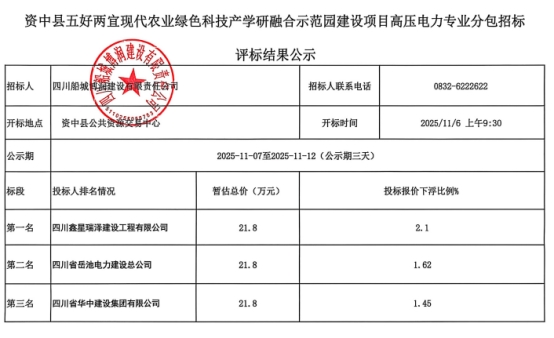 资中县五好两宜现代农业绿色科技产学研融合示范园建设项目高压电力专业分包招标评标结果公示