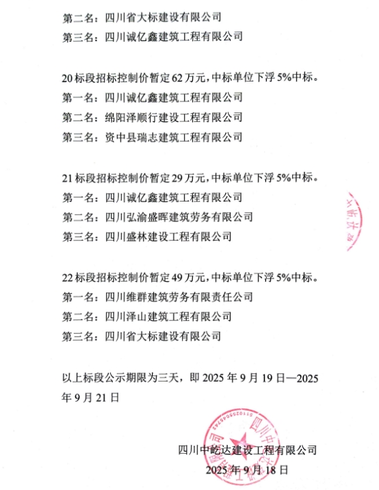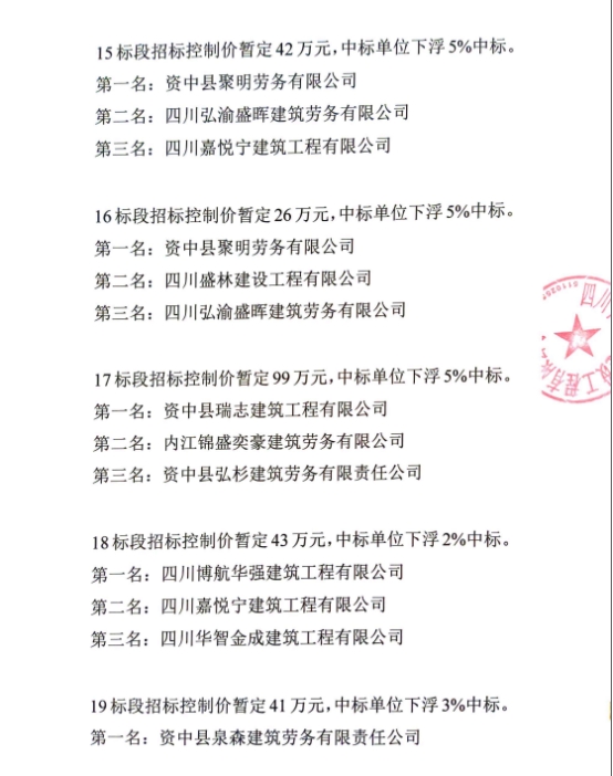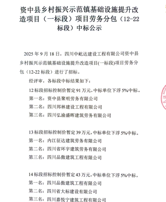 中标结果公示资中县乡村振兴示范镇基础设施提升改造项目劳务分包12-22标段