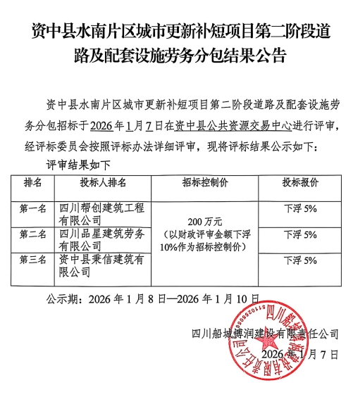 资中县水南片区城市更新补短项目第二阶段道路及配套设施劳务分包结果公示