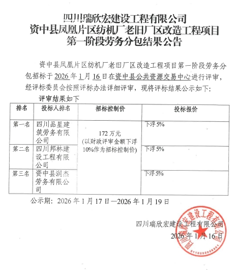 资中县凤凰片区纺机厂老旧厂区改造工程项目第一阶段劳务分包结果公告