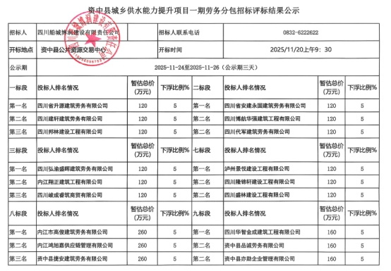 资中县城乡供水能力提升项目一期劳务分包招标评标结果公示
