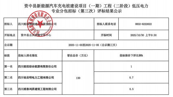 资中县新能源汽车充电桩建设项目(一期)工程(二阶段)低压电力专业分包招标(第三次)结果公示