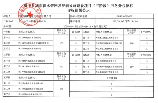 资中县和美居生态环境改善示范项目(四标段)十一标段劳务分包招标评标结果公示