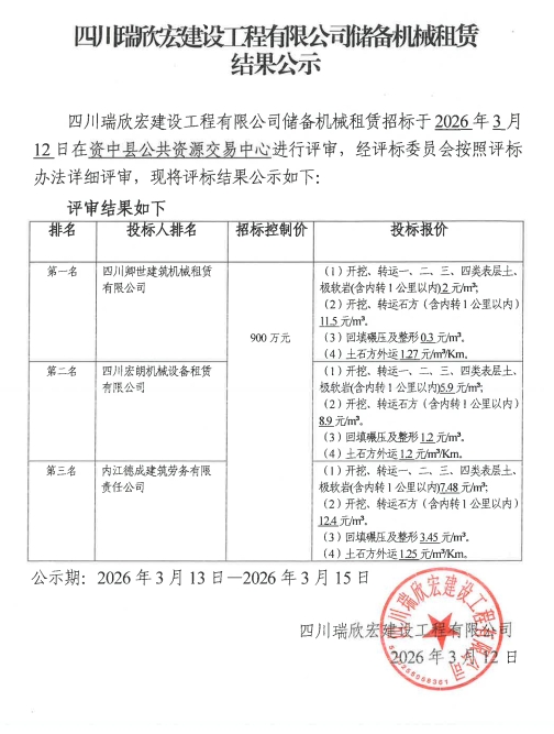 四川瑞欣宏建设工程有限公司储备机械租赁结果公示
